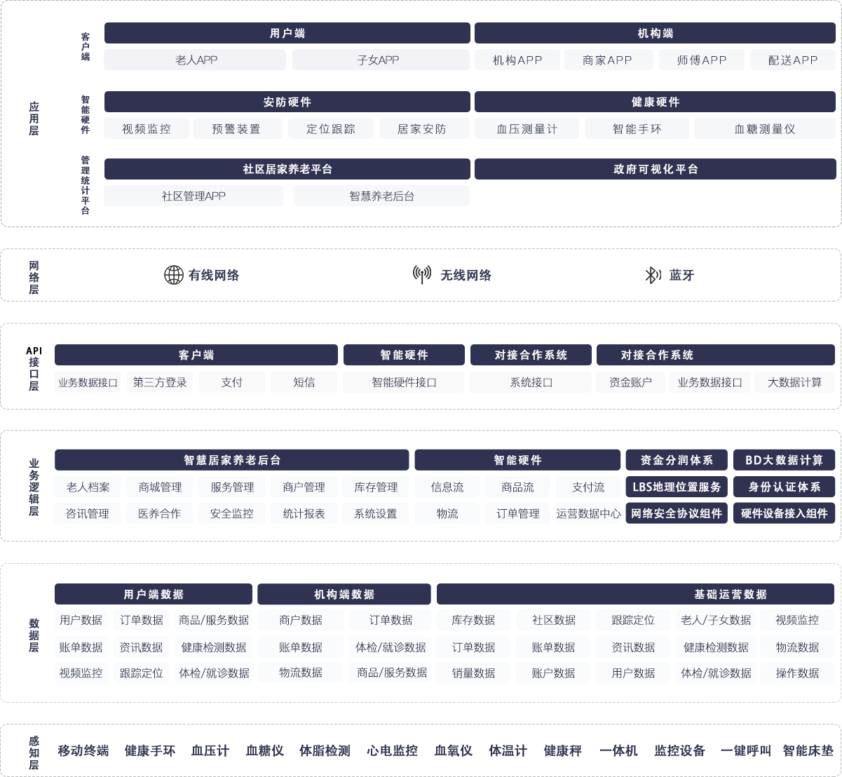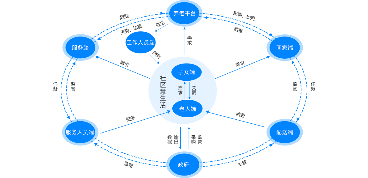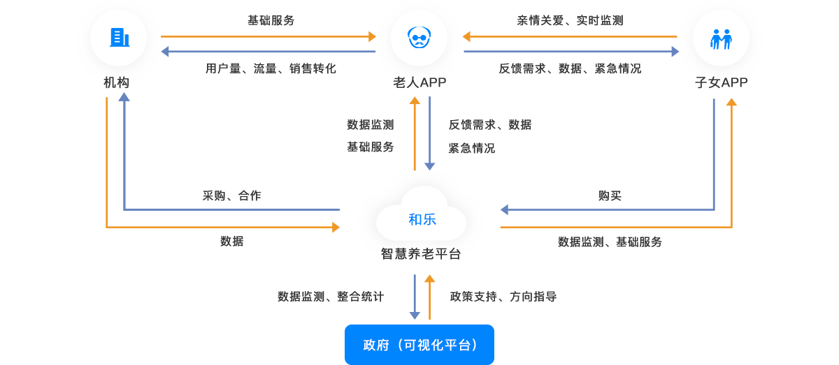 通過跨終端的數(shù)據(jù)互聯(lián)及同步,連通各部門及角色,形成一個(gè)完整的智慧養(yǎng)老管理閉環(huán),實(shí)現(xiàn)了老人、子女、服務(wù)中心、服務(wù)商家、社區(qū)物業(yè)、政府的信息交互與聯(lián)動(dòng),促進(jìn)了線上、線下業(yè)務(wù)的深度融合,為老年人提供低成本、高效率、適配性強(qiáng)、安全可靠、觸手可及的全方位智慧健康養(yǎng)老服務(wù)。